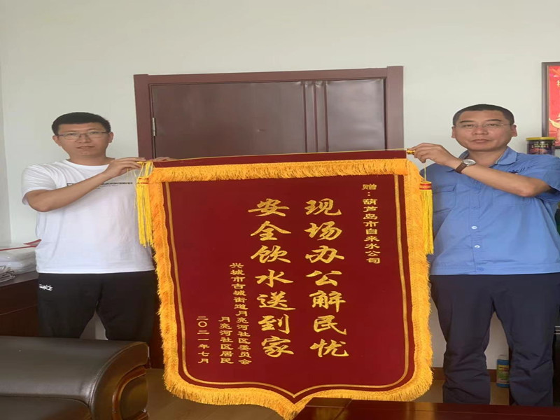 7月28日,興城市古城街道月亮河社區(qū)委員會和社區(qū)居民代表來到葫蘆島市自來水公司,送來一面“現(xiàn)場辦公解民憂?安全飲水送到家”的錦旗,衷心感謝自來水公司領(lǐng)導(dǎo),上門服務(wù)現(xiàn)場辦公,積極協(xié)調(diào)解決了小區(qū)水壓問題,改善了小區(qū)居民的居住質(zhì)量。