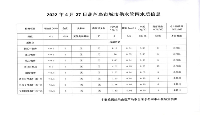 2022年4月27日葫蘆島市城市供水管網(wǎng)水質(zhì)信息