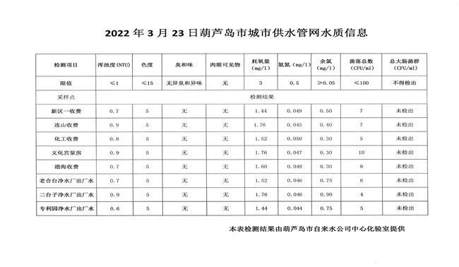 2022年3月23日葫蘆島市城市供水管網(wǎng)水質(zhì)信息