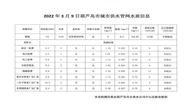 2022年3月9日葫蘆島市城市供水管網(wǎng)水質(zhì)信息
