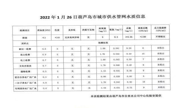 2022年1月26日葫蘆島市城市供水管網(wǎng)水質(zhì)信息