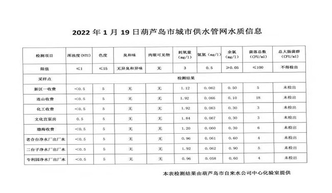 2022年1月19日葫蘆島市城市供水管網(wǎng)水質(zhì)信息