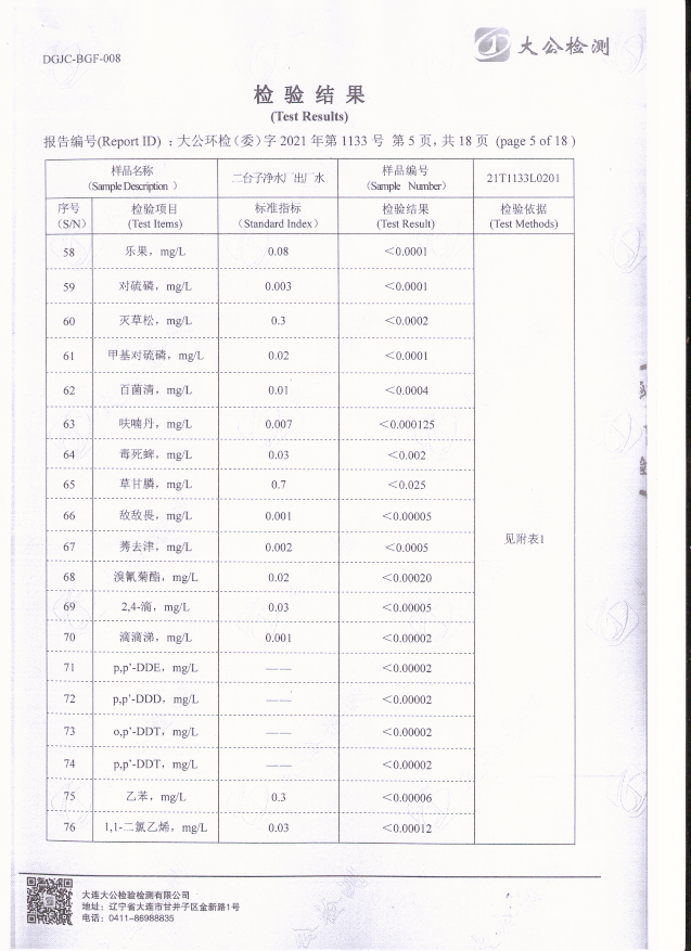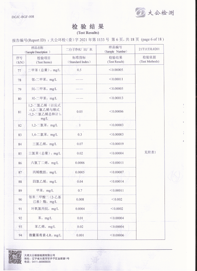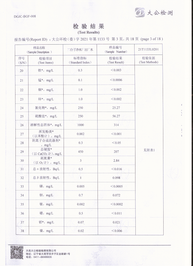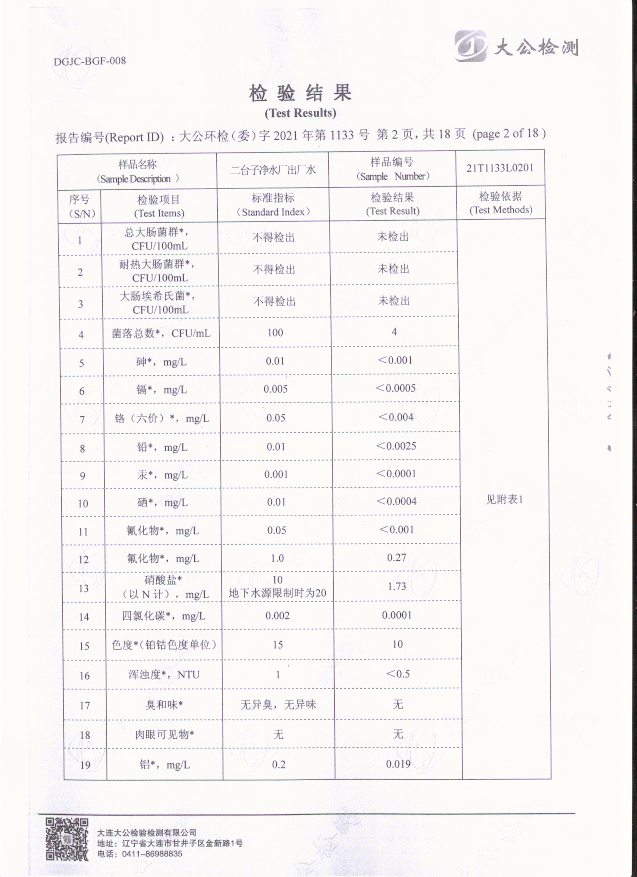 二臺子凈水廠出廠水檢驗報告