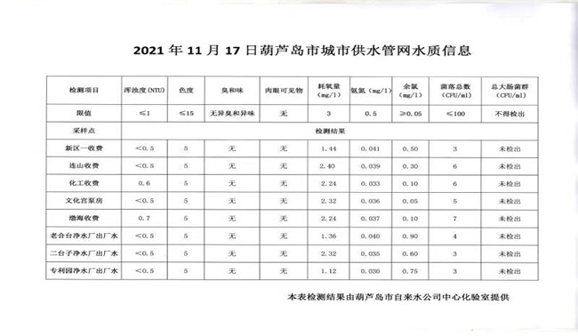 2021年11月17日葫蘆島市城市供水管網(wǎng)水質(zhì)信息