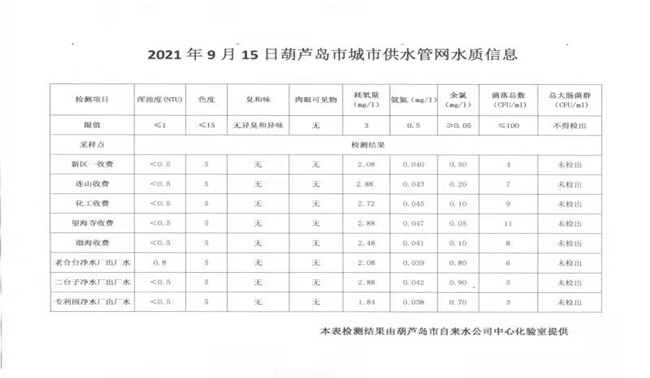 2021年9月15日葫蘆島市城市供水管網(wǎng)水質(zhì)信息