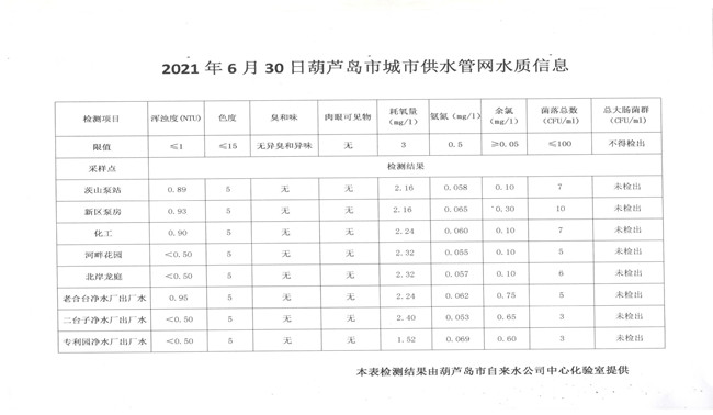 2021年6月30日葫蘆島市城市供水管網水質信息