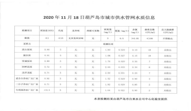 2020年11月18日葫蘆島市城市供水管網(wǎng)水質(zhì)信息