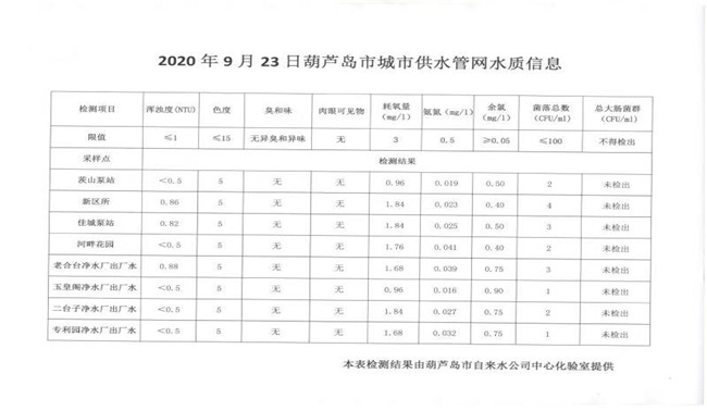 2020年9月23日葫蘆島市城市供水管網(wǎng)水質(zhì)信息