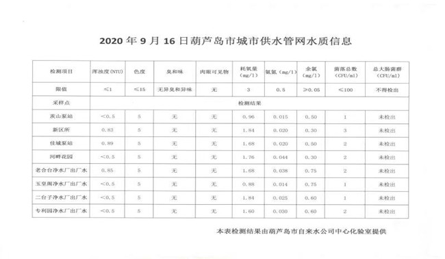 2020年9月16日葫蘆島市城市供水管網(wǎng)水質信息