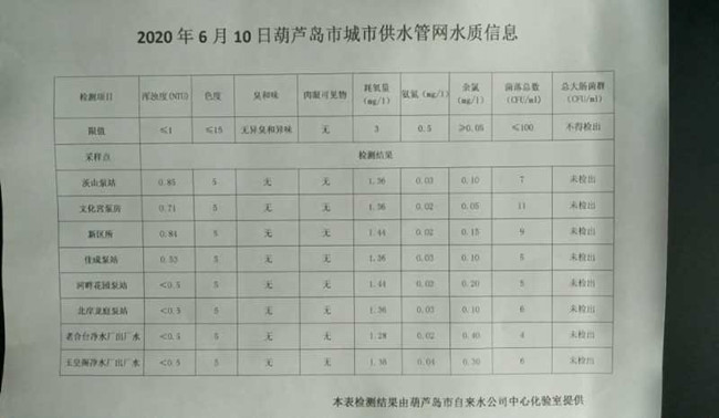 2020年6月10日葫蘆島市城市供水管網(wǎng)水質(zhì)信息