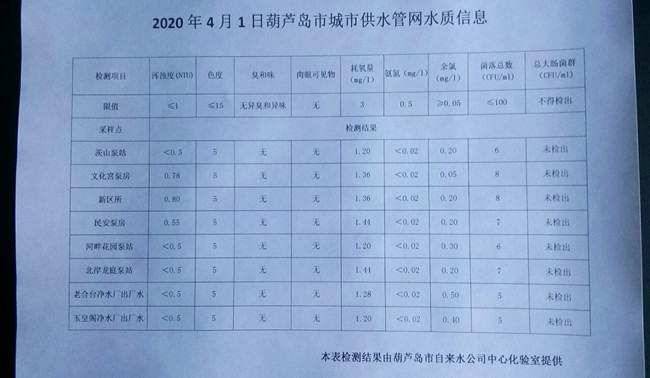 2020年4月1日葫蘆島市城市供水管網(wǎng)水質(zhì)信息