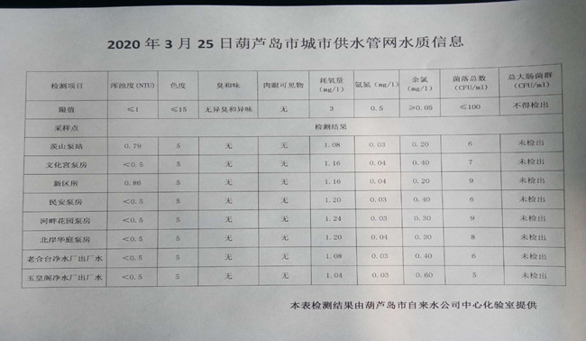 2020年3月25日葫蘆島市城市供水管網(wǎng)水質(zhì)信息