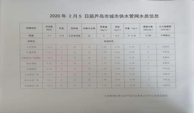 2020年2月5日葫蘆島市城市供水管網(wǎng)水質信息