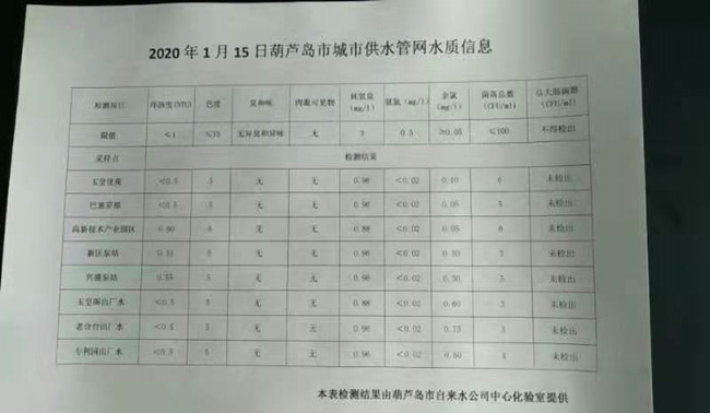 2020年1月15日葫蘆島市城市供水管網(wǎng)水質(zhì)信息