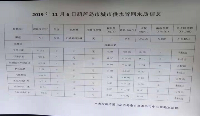 2019年11月6日葫蘆島市城市供水管網(wǎng)水質(zhì)信息