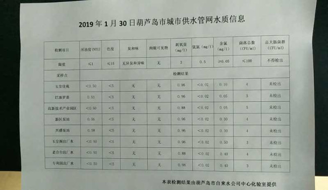 2019年1月30日葫蘆島市城市供水管網(wǎng)水質(zhì)信息