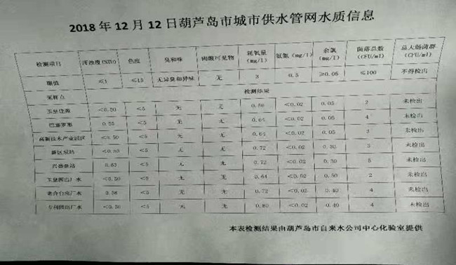 2018年12月12日葫蘆島市城市供水管網(wǎng)水質(zhì)信息