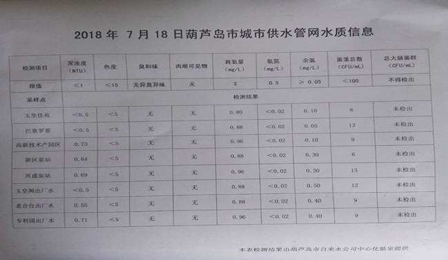 2018年7月18日葫蘆島市城市供水管網(wǎng)水質(zhì)信息