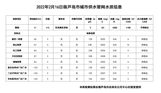 2022年2月16日葫蘆島市城市供水管網(wǎng)水質(zhì)信息