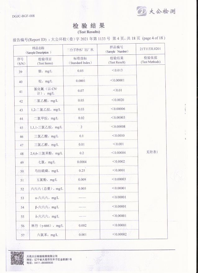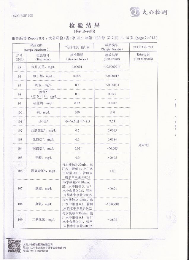 二臺子凈水廠出廠水檢驗報告