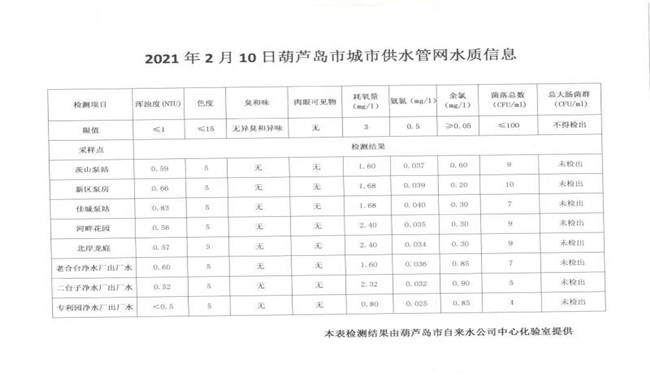 2021年2月10日葫蘆島市城市供水管網(wǎng)水質(zhì)信息