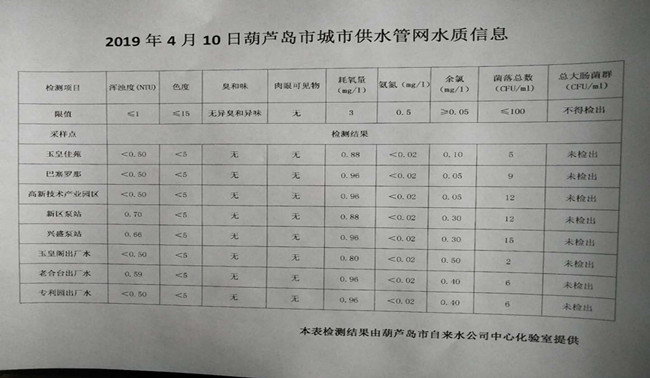 2019年4月10日葫蘆島市城市供水管網(wǎng)水質(zhì)信息