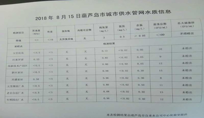 2018年8月15日葫蘆島市城市供水管網(wǎng)水質(zhì)信息
